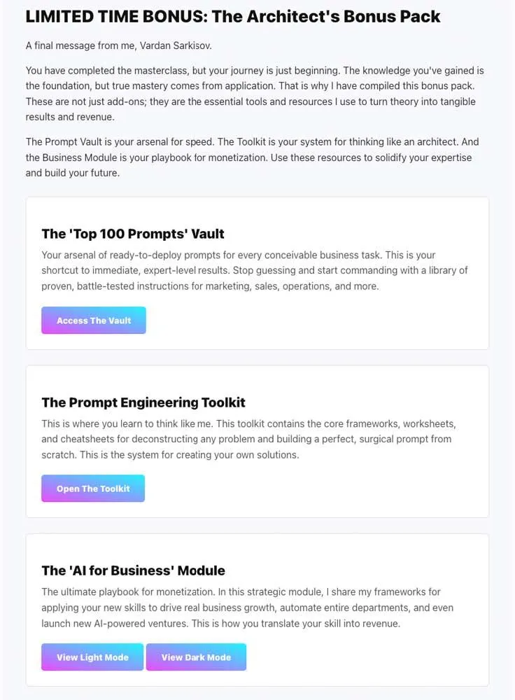 MODULE 1: The Architect's Mindset - Master my 5-step method for crafting "perfect prompts" that define roles, tasks, and output formats for precise results on the first try.